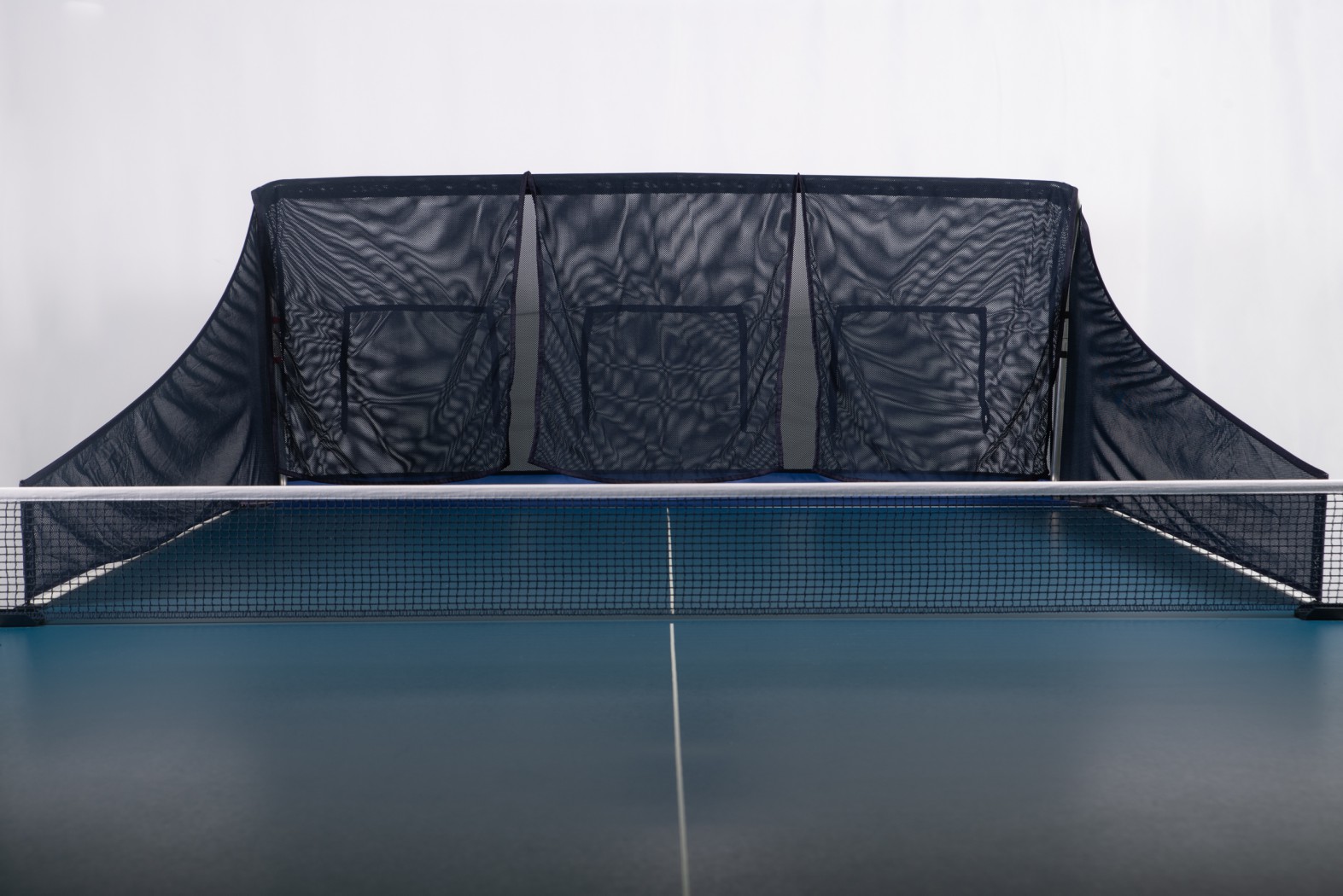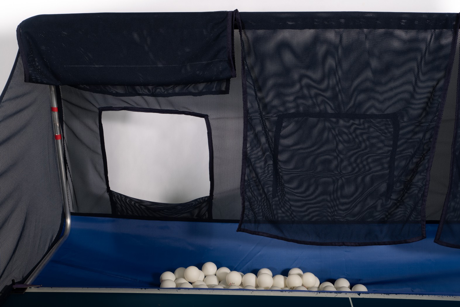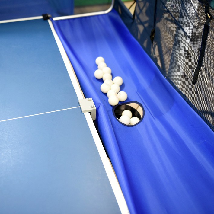 Для тренировок с роботом предусмотрены 3 отверстия: в правой части стола, по центру, слева. При игре без робота отверстия закрыты (фиксация на липучке). Дополнительные шторки выполняют функцию амортизации, уменьшая отскок мячей.