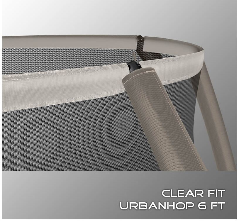 В 2026 году представлена обновленная линейка с улучшенной конструкцией каркаса. Усиление достигнуто за счет использования прочных Т-образных кронштейнов из металла толщиной 1.9 мм. Кроме того, в комплектацию добавлен карман для обуви. Каркасный батут с защитной сеткой Clear Fit серии UrbanHop — отличаются комфортом и надежностью. Надежная рама из качественных комплектующих, прочная защитная сеть снабжена прямым креплением к прыжковому полотну и дополнительной защитой входа, наверху каркасное жесткое крепления, сеть не провисает и не слетает во время тренировок. Увлекательный, полезный и безопасный тренажер для всей семьи. Батуты серии UrbanHop 6Ft и 8Ft поставляются в оптимальной для комфорта и безопасности комплектации: батут, верхняя защитная сеть, защитный мат и карман для обуви. Размер батута 8 футов с прыжковой поверхностью 2.015 м легко разместить на любом участке, он подойдет и для детских игр, и для тренировок. Верхняя защитная сеть оберегает от падений, усиленная молния и дополнительная защита входа уберегут малышей от случайного входа или падения. Надежный каркас из гальванизированной стали, качественные комплектующие и погодостойкие метизы рамы делают батут безопасным, устойчивым, надежным, гарантируют полную защиту от коррозии и долгий срок службы. Максимальный вес пользователя батута UrbanHop 8Ft — до 160 кг.